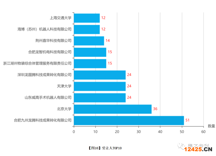 受讓人TOP10如【圖10】所示,其中,合肥九州龍騰科技成果轉(zhuǎn)化有限公司獲得 51 件專利,北京大學(xué)獲得 36 件專利,山東威高手術(shù)機器人有限公司獲得 24 件專利。