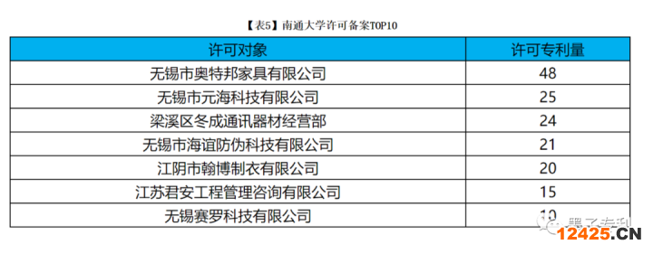 2022年9月全國高校與科研院所共 484 件專利發(fā)生了 520 次許可備案,其中 52 件專利發(fā)生 52 次獨占許可備案,423 件專利發(fā)生了 459 次普通許可備案,9 件專利發(fā)生了 9 次排他許可備案,如【圖11】所示;許可人情況如【圖12】,南通大學(xué) 163 件專利發(fā)生許可備案。許可量第一的南通大學(xué)的專利許可備案情況如【表5】所示: