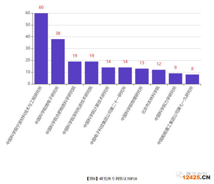 2022年9月全國高校專利轉(zhuǎn)讓分布如【圖7】,江蘇省以 284 件專利發(fā)生轉(zhuǎn)讓位居第一、浙江省 182 件、北京 121 件;轉(zhuǎn)讓專利TOP10的高校如【圖8】,其中北京大學(xué)轉(zhuǎn)讓 37 件專利位居第一、天津大學(xué)轉(zhuǎn)讓 35 件專利位居第二,其次是西安交通大學(xué)轉(zhuǎn)讓 31 件專利;科研院所專利轉(zhuǎn)讓TOP10如【圖9】,其中, 中國科學(xué)院寧波材料技術(shù)與工程研究所,中國科學(xué)院微電子研究所 60 件和 38 件,分別排名第一、第二。