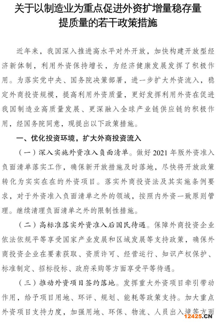 國家發(fā)展改革委等部門印發(fā)《關(guān)于以制造業(yè)為重點促進外資擴增量穩(wěn)存量提質(zhì)量的若干政策措施》的通知