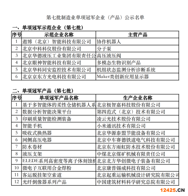 關(guān)于北京市第七批制造業(yè)單項(xiàng)冠軍企業(yè)(產(chǎn)品)和第一批、第四批制造業(yè)單項(xiàng)冠軍企業(yè)(產(chǎn)品)復(fù)核通過(guò)名單的公示