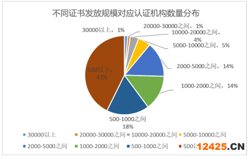 按照認(rèn)證證書數(shù)量對認(rèn)證機(jī)構(gòu)的規(guī)模進(jìn)行分層分析,發(fā)證情況見下表。