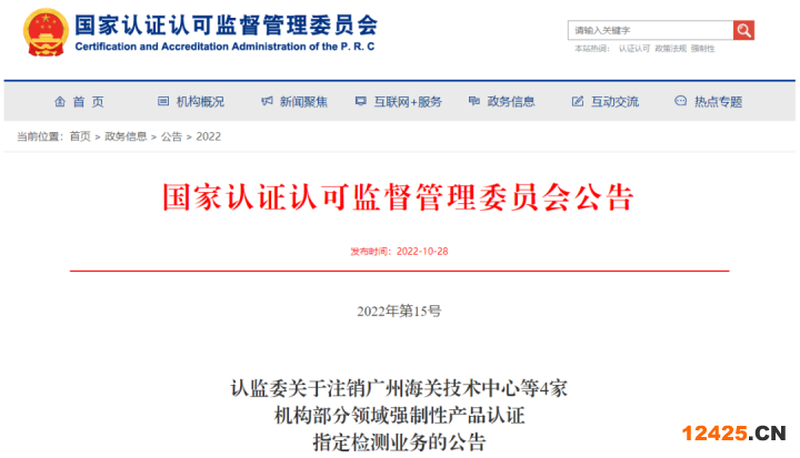 認(rèn)監(jiān)委關(guān)于注銷廣州海關(guān)技術(shù)中心等4家機(jī)構(gòu)部分領(lǐng)域強(qiáng)制性產(chǎn)品認(rèn)證指定檢測(cè)業(yè)務(wù)的公告