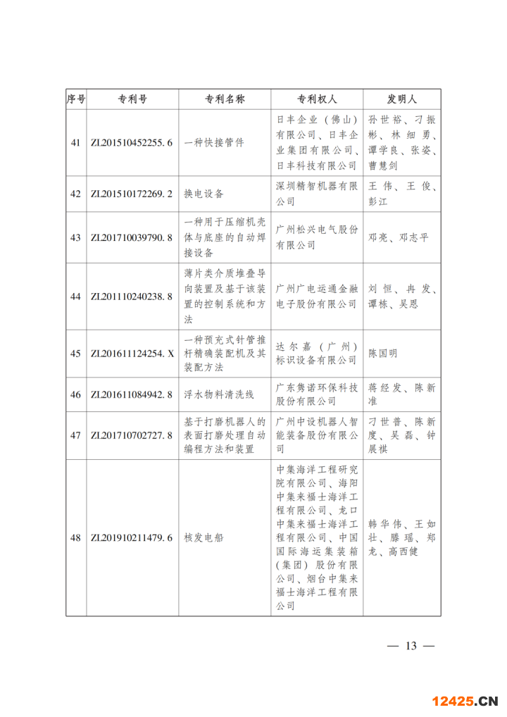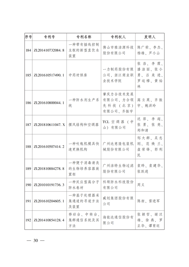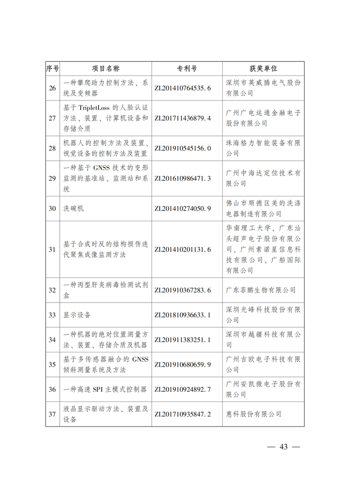 第二十三屆中國專利獎嘉獎和第九屆廣東專利獎獲獎名單