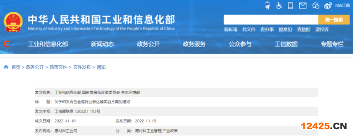 工業(yè)和信息化部等三部門關(guān)于印發(fā)有色金屬行業(yè)碳達峰實施方案的通知