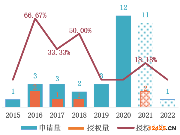 圖5 騰訊在圖片文字提取技術(shù)領(lǐng)域的專利申請趨勢及授權(quán)狀況(申請量:件)