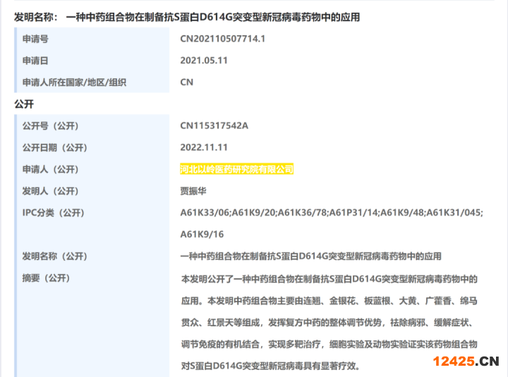 11月11日, 河北以嶺醫(yī)藥研究院有限公司公開發(fā)明專利“一種中藥組合物在制備抗S蛋白D614G突變型新冠病毒藥物中的應(yīng)用”。