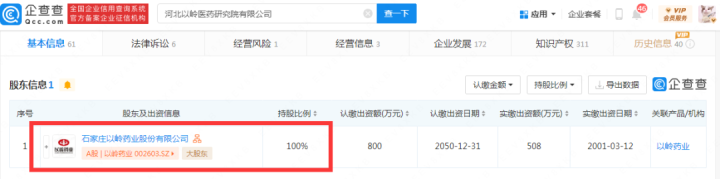 企查查股權(quán)穿透信息顯示,該公司由以嶺藥業(yè)(39.660. 1.90. 5.03%)100%持股。