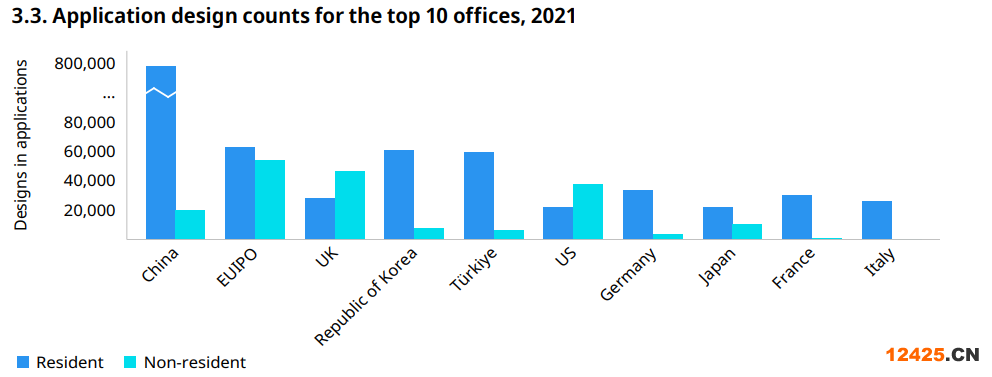 排名前二十的主管局中,英國(+128.5%)、印度(+67.6%)、墨西哥(+38.4%)和土耳其(+38.3%)在2021年的外觀設(shè)計(jì)申請活動(dòng)量增長強(qiáng)勁。