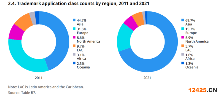 亞洲占2021年所有商標(biāo)申請活動(dòng)量的69.7%,高于2011年的44.7%。歐洲的份額從2011年的31.6%下降到2021年的15.7%。北美占2021年世界總量的5.9%,而非洲、拉丁美洲和加勒比地區(qū)以及大洋洲在2021年的份額為8.7%。