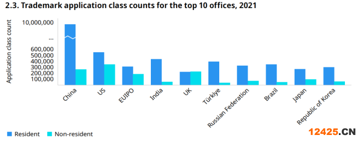 據(jù)估計(jì),2021年149個(gè)知識產(chǎn)權(quán)局約有7.370萬件有效商標(biāo)注冊,比2020年增長14.3%,其中,僅中國就有3.720萬件,美國(280萬)和印度(260萬)次之。