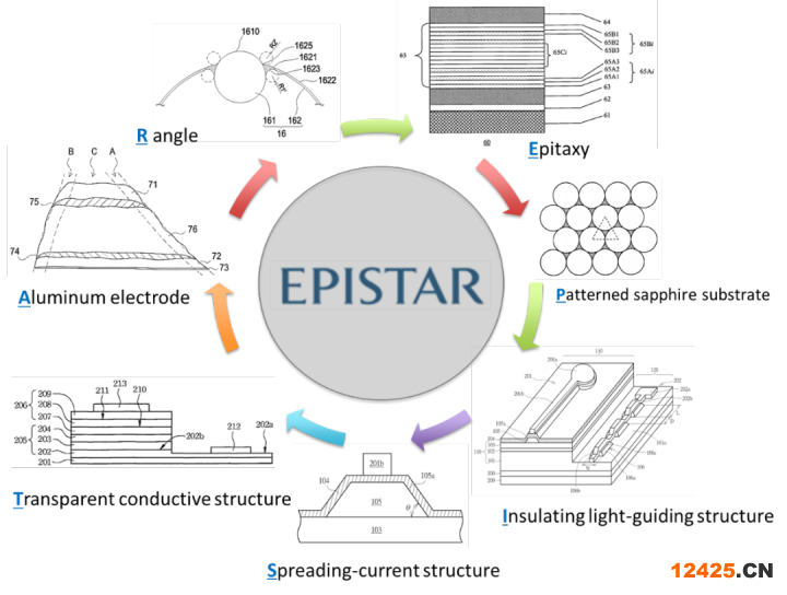 晶電的專利包括具有多重量子井結(jié)構(gòu)的磊晶(Epitaxy)、圖案化基板(Patterned sapphire substrate)、具有絕緣材料的導(dǎo)光結(jié)構(gòu)(Insulating light-guiding structure)、電流擴散結(jié)構(gòu)(Spreading current structure)、具有銦氧組成變化的透明導(dǎo)電結(jié)構(gòu)(Transparent conductive structure)、具有鋁金屬的電極(Aluminum electrode)、以及具有弧形的電極設(shè)計(R angle)等關(guān)鍵技術(shù)。這些投資奠定了LED背光技術(shù)基礎(chǔ),從芯片到本案中的電視所使用的LED背光模塊。