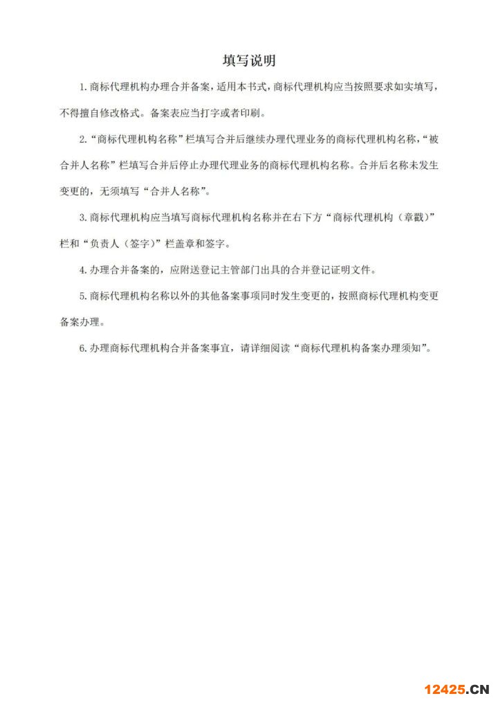 1.按要求填寫《商標代理機構(gòu)合并備案表》(打字或者印刷),在指定位置加蓋商標代理機構(gòu)章戳、負責人簽字。