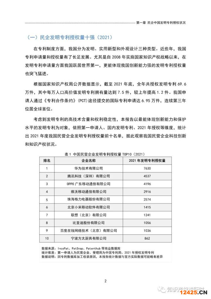 核心提示:近日,研究中心發(fā)布《中國(guó)民營(yíng)企業(yè)發(fā)明專利授權(quán)量報(bào)告(2021)》。數(shù)據(jù)顯示,2021年,我國(guó)發(fā)明專利授權(quán)量達(dá)69.6萬(wàn)件,排名前十位的國(guó)內(nèi)企業(yè)中