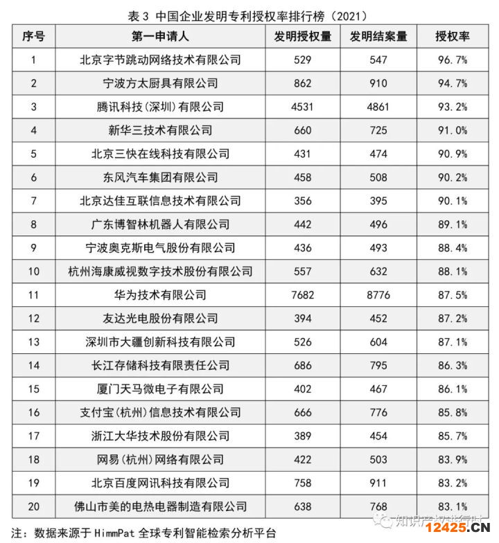 研究表明,民營(yíng)企業(yè)研發(fā)投入費(fèi)用持續(xù)增長(zhǎng),創(chuàng)新成果產(chǎn)出持續(xù)增加,2021年度排名前十位的民營(yíng)企業(yè),近三年發(fā)明專利授權(quán)量年均增速達(dá)49.25%。縱觀發(fā)明專利授權(quán)量排名領(lǐng)先的這十家民營(yíng)企業(yè),整體專利質(zhì)量要高于平均水平。僅從發(fā)明專利授權(quán)率一個(gè)角度來(lái)看:2021年,我國(guó)發(fā)明專利授權(quán)率為55.0%,而上榜的寧波方太廚具有限公司,2021年份發(fā)明專利授權(quán)率達(dá)到94.7%,在發(fā)明專利結(jié)案量前20企業(yè)中排名第二,僅次于字節(jié)跳動(dòng);騰訊科技(深圳)有限公司發(fā)明專利授權(quán)率達(dá)到了93.2%;華為技術(shù)有限公司、北京百度網(wǎng)訊科技有限公司的發(fā)明專利授權(quán)率分別為87.5%和83.2%。通過(guò)發(fā)明專利的授權(quán)率,可以從側(cè)面看出企業(yè)的技術(shù)創(chuàng)新能力和專利質(zhì)量水平,發(fā)明專利授權(quán)率越高,代表企業(yè)在技術(shù)創(chuàng)新和申請(qǐng)專利時(shí)更加重視知識(shí)產(chǎn)權(quán)質(zhì)量。