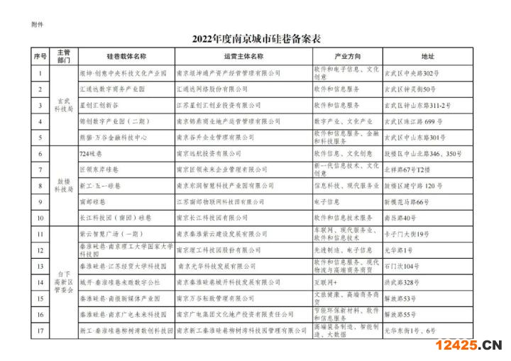 市科技局關(guān)于公布2022年度南京城市硅巷名單的通知