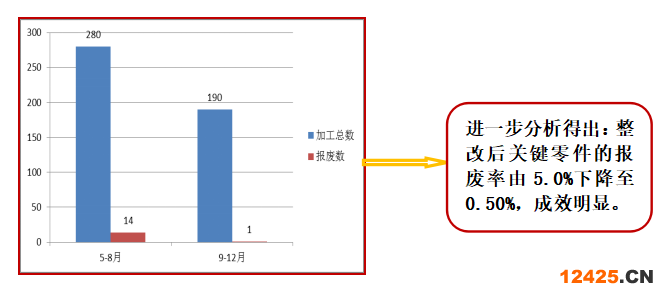 4、2021年5-8月關鍵零部件加工總數(shù)為280件,因設備能力不足造成的報廢數(shù)14件,報廢率為總加工數(shù)的5.0%;2021年9-12月整改后,關鍵零部件加工總數(shù)為190件,因設備能力原因造成的報廢數(shù)為1件,報廢率為總加工數(shù)的0.50%,整改后取得的成效明顯。