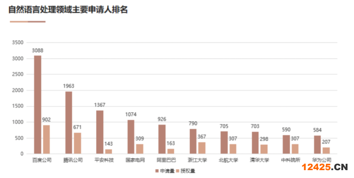 報(bào)告顯示,自然語(yǔ)言處理領(lǐng)域?qū)@暾?qǐng)量百度公司、騰訊公司、平安科技專利申請(qǐng)量均超過1300件,專利技術(shù)積累豐厚,形成了一定的技術(shù)競(jìng)爭(zhēng)力。從技術(shù)分布上看,自然語(yǔ)言處理所涉及的分支較為分散,涵蓋了多個(gè)技術(shù)方向,如G06N3/08(學(xué)習(xí)方法)、G06K9/62(應(yīng)用電子設(shè)備進(jìn)行識(shí)別的方法或裝置)、G06F40/30(語(yǔ)義分析)等。