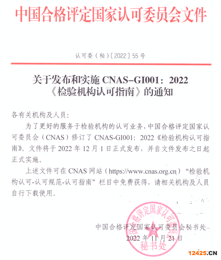 中國合格評定國家認可委員會于2022年12月1日發(fā)布CNAS-GI001:2022《檢驗機構(gòu)認可指南》,并自文件發(fā)布之日起正式實施。