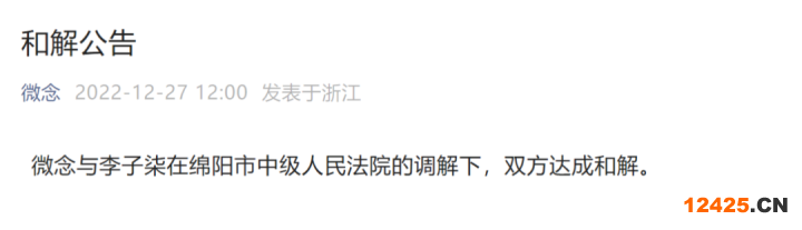 2022年12月27日,杭州微念品牌管理有限公司在其公眾號(hào)發(fā)布和解公告,聲稱微念與李子柒在綿陽(yáng)市中級(jí)人民法院的調(diào)解下,雙方達(dá)成和解。