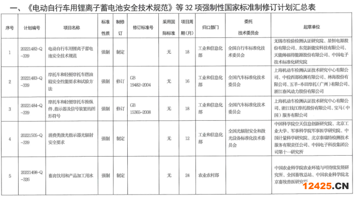 日前,《國家標(biāo)準(zhǔn)化管理委員會關(guān)于下達(dá)〈電動自行車用鋰離子蓄電池安全技術(shù)規(guī)范〉等32項(xiàng)強(qiáng)制性國家標(biāo)準(zhǔn)制修訂計劃及相關(guān)標(biāo)準(zhǔn)外文版計劃的通知》正式發(fā)布,具體內(nèi)容如下: