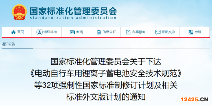 《電動自行車用鋰離子蓄電池安全技術(shù)規(guī)范》等32項(xiàng)強(qiáng)制性國家標(biāo)準(zhǔn)制修訂計劃及相關(guān)標(biāo)準(zhǔn)外文版計劃公布