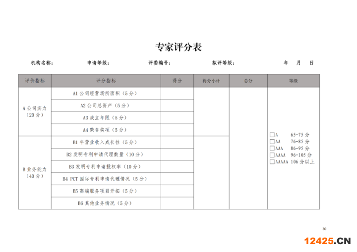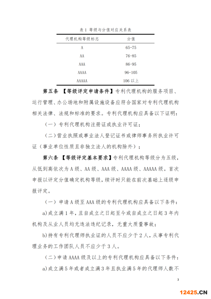 專利代理機構(gòu)等級分為五級,從低到高依次為A級、AA級、AAA級、AAAA級、AAAAA級。首次申報以評定分值確定機構(gòu)等級,續(xù)評時只能在前次基礎(chǔ)上逐級申報評定。