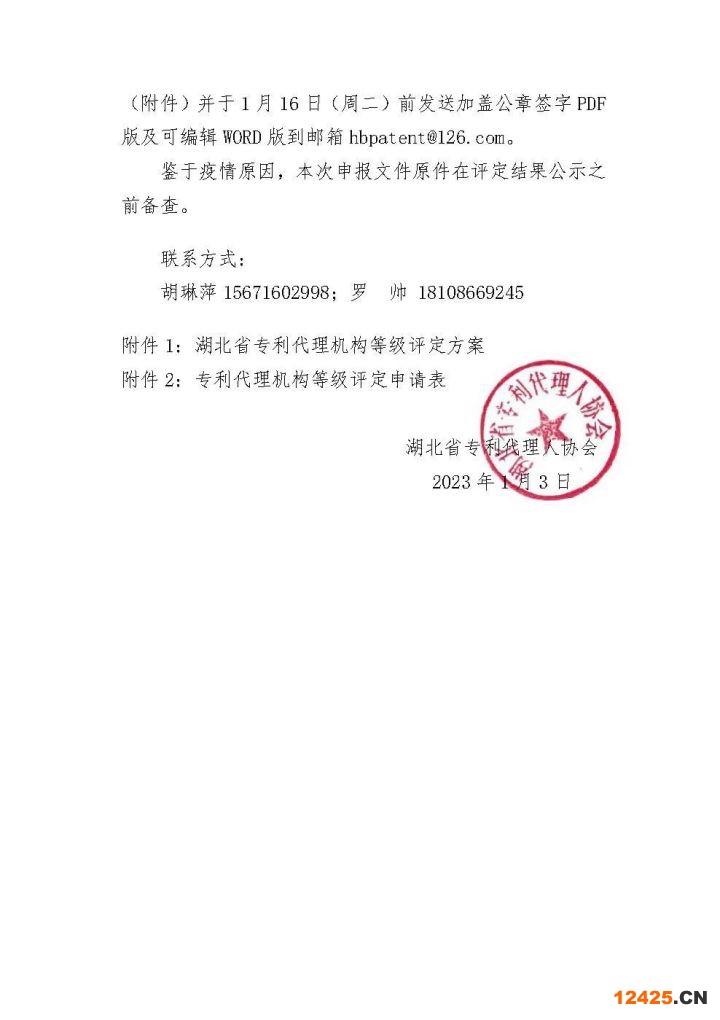 附件1 湖北省專利代理機構(gòu)等級評定方案.pdf附件2 專利代理機構(gòu)等級評定申請表.docx湖北省專利代理人協(xié)會2023年1月3日