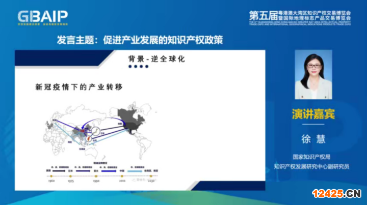 國(guó)家知識(shí)產(chǎn)權(quán)局知識(shí)產(chǎn)權(quán)發(fā)展研究中心副研究員徐慧以“促進(jìn)產(chǎn)業(yè)發(fā)展的知識(shí)產(chǎn)權(quán)政策”為主題,表示新冠疫情下全球產(chǎn)業(yè)遭遇重創(chuàng),為應(yīng)對(duì)疫情影響,關(guān)鍵要推動(dòng)科技創(chuàng)新和技術(shù)進(jìn)步,并指出知識(shí)產(chǎn)權(quán)密集型產(chǎn)業(yè)對(duì)經(jīng)濟(jì)發(fā)展貢獻(xiàn)重大,應(yīng)基于激勵(lì)創(chuàng)新、保護(hù)創(chuàng)新、注重創(chuàng)新成果三方面,推動(dòng)創(chuàng)新成果轉(zhuǎn)化,促進(jìn)產(chǎn)業(yè)全面升級(jí)。