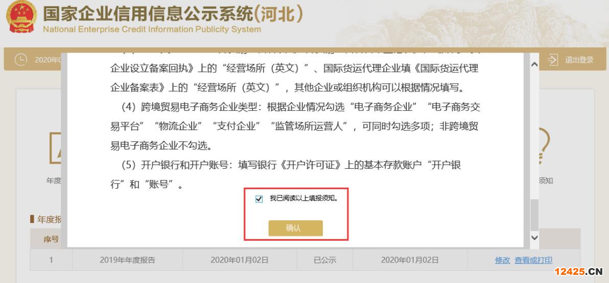 閱讀年報(bào)填報(bào)須知,將填報(bào)須知頁(yè)面拖動(dòng)到底部,在“我已閱讀以上填報(bào)須知”前打勾,點(diǎn)擊“確認(rèn)”按鈕。