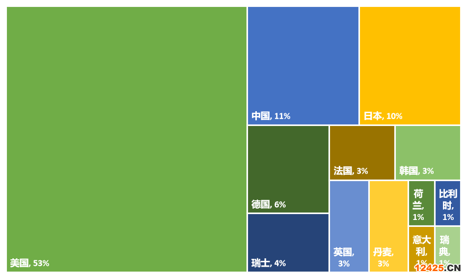 入榜前100名企業(yè)/醫(yī)院主要來自13個國家、組織或地區(qū),美國占比53%,其次為中國占比11%,日本占比10%;德國占比6%、瑞士占比4%;法國、韓國、英國和丹麥分別占比3%;荷蘭、比利時、意大利和瑞典各占比1%。