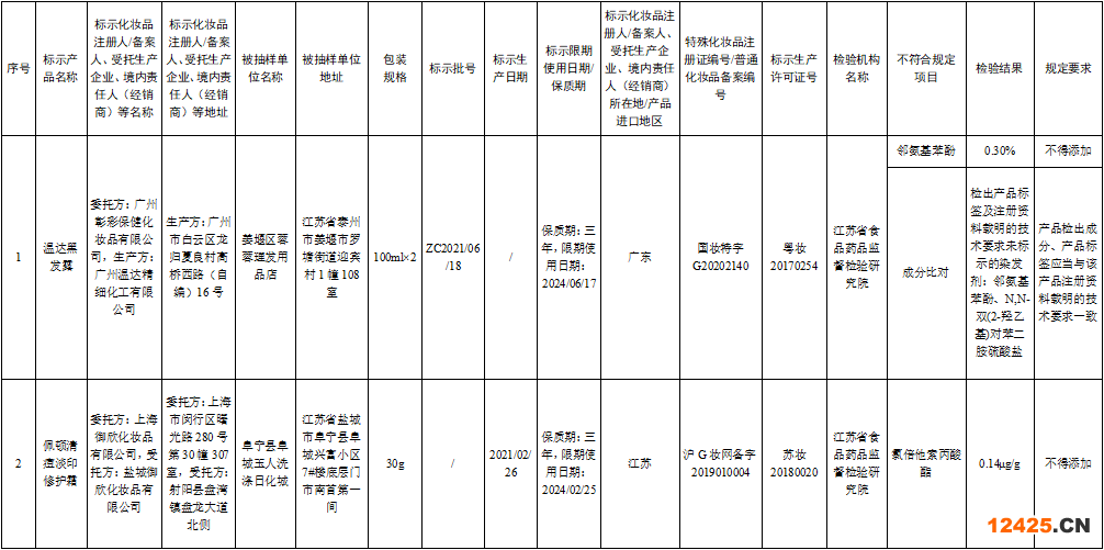 在2022年國家化妝品監(jiān)督抽檢工作中,經(jīng)江蘇省食品藥品監(jiān)督檢驗研究院檢驗,標簽標示為委托方廣州彰彩保健化妝品有限公司、生產(chǎn)方廣州溫達精細化工有限公司生產(chǎn)的溫達黑發(fā)露等13批次化妝品,檢出《化妝品安全技術(shù)規(guī)范(2015年版)》中規(guī)定的禁用原料(見附件)。其中,上述標簽標示名稱為溫達黑發(fā)露的產(chǎn)品檢出禁用原料的同時,還存在產(chǎn)品成分比對不符合規(guī)定的問題。
