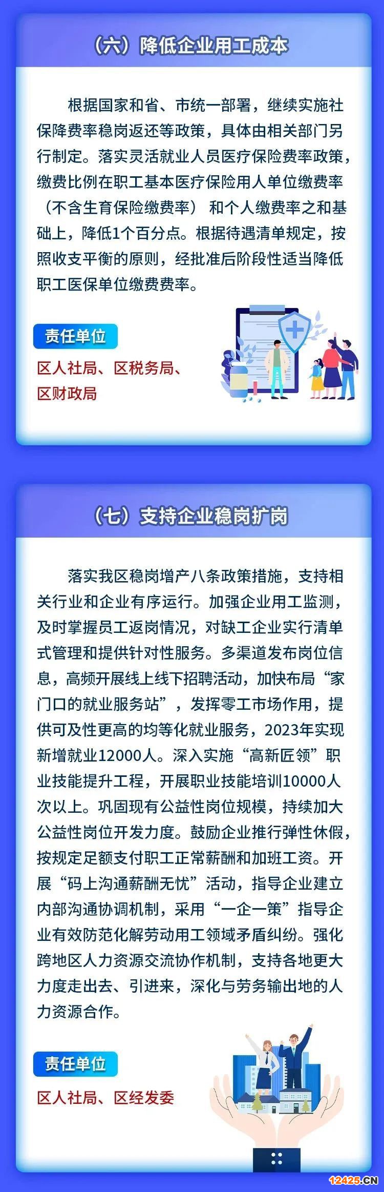 15. 鼓勵訂單較多、生產(chǎn)任務(wù)較重的企業(yè),根據(jù)實際情況增加一季度生產(chǎn)安排。鼓勵企業(yè)推行彈性休假,按規(guī)定足額支付職工正常薪酬和加班工資。開展企業(yè)用工保障專項行動暨“春風(fēng)行動”活動,積極開展各類線上線下協(xié)同招聘活動。對人力資源服務(wù)機(jī)構(gòu)成功推薦符合條件的失業(yè)人員、就業(yè)困難人員并實現(xiàn)穩(wěn)定就業(yè)的,分別給予1000 元/人、1500 元/人的職業(yè)介紹補貼。聚焦重點產(chǎn)業(yè),積極開展職業(yè)技能培訓(xùn),著力提升職工職業(yè)技能水平,服務(wù)企業(yè)高質(zhì)量用工需求。鞏固現(xiàn)有城鄉(xiāng)公益性崗位規(guī)模,持續(xù)加大崗位開發(fā)力度,落實2023年新創(chuàng)設(shè)城鄉(xiāng)公益性崗位50個以上。(責(zé)任單位:區(qū)人社局、區(qū)工信局、區(qū)財政局)
