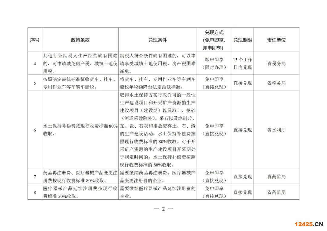 1﹒深入落實(shí)稅收優(yōu)惠政策。繼續(xù)減征“六稅兩費(fèi)”。落實(shí)對月銷售額10萬元以下的增值稅小規(guī)模納稅人免征增值稅政策,實(shí)施小規(guī)模納稅人增值稅征收率由3%降至1%的優(yōu)惠政策。對住宿餐飲、文體娛樂、交通運(yùn)輸、旅游、零售、倉儲行業(yè)納稅人和增值稅小規(guī)模納稅人,暫免征收2023年上半年房產(chǎn)稅、城鎮(zhèn)土地使用稅。其他行業(yè)納稅人生產(chǎn)經(jīng)營確有困難的,可申請減免房產(chǎn)稅、城鎮(zhèn)土地使用稅。按照法定最低標(biāo)準(zhǔn)征收貨車、掛車、專用作業(yè)車等車輛車船稅。(責(zé)任單位:省稅務(wù)局)
