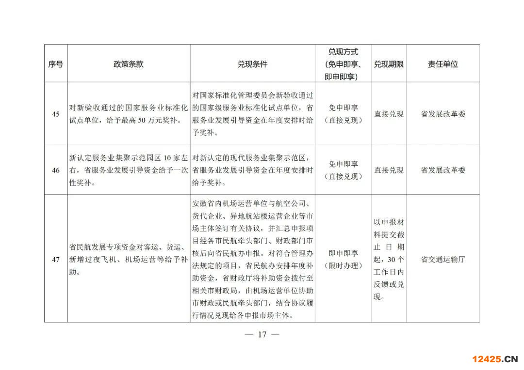 16﹒支持服務(wù)業(yè)高質(zhì)量發(fā)展。省服務(wù)業(yè)發(fā)展引導(dǎo)資金優(yōu)先支持生產(chǎn)性服務(wù)業(yè)融合發(fā)展、創(chuàng)新發(fā)展、集聚發(fā)展。對國家及省級“兩業(yè)融合”試點(diǎn)示范類項(xiàng)目、創(chuàng)新型公共服務(wù)平臺,給予不超過核定投資10%的補(bǔ)助。對新驗(yàn)收通過的國家服務(wù)業(yè)標(biāo)準(zhǔn)化試點(diǎn)單位,給予最高50萬元獎補(bǔ)。新認(rèn)定服務(wù)業(yè)集聚示范園區(qū)10家左右,省服務(wù)業(yè)發(fā)展引導(dǎo)資金給予一次性獎補(bǔ)。(責(zé)任單位:省發(fā)展改革委)省民航發(fā)展專項(xiàng)資金對客運(yùn)、貨運(yùn)、新增過夜飛機(jī)、機(jī)場運(yùn)營等給予補(bǔ)助。(責(zé)任單位:省交通運(yùn)輸廳)