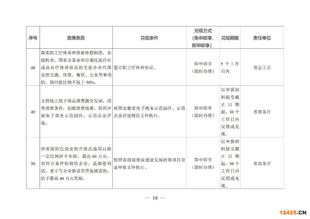 17﹒促進(jìn)接觸性消費(fèi)加快恢復(fù)。開展以“品質(zhì)生活徽動消費(fèi)”為主題的促消費(fèi)活動5000場以上,鼓勵各地在餐飲、住宿、文旅、零售等領(lǐng)域發(fā)放消費(fèi)券,引導(dǎo)商圈、平臺和商家配套開展打折、滿減等優(yōu)惠活動。(責(zé)任單位:省商務(wù)廳,配合單位:省文化和旅游廳)省市聯(lián)動舉辦“文化惠民消費(fèi)季”“皖美好味道·百縣名小吃”活動。(責(zé)任單位:省文化和旅游廳)落實(shí)職工療休養(yǎng)和帶薪休假制度,各級機(jī)關(guān)、國有企事業(yè)單位委托旅行社或具有療休養(yǎng)資質(zhì)的文旅企業(yè)代理安排交通、住宿、餐飲、會務(wù)等事項(xiàng)的,預(yù)付款比例不低于50%。(責(zé)任單位:省總工會)邀請境外旅行商、媒體來安徽踩線采風(fēng)、對接合作,推出更多適應(yīng)境外游客需求的旅游產(chǎn)品、線路和服務(wù)。鼓勵各地結(jié)合當(dāng)?shù)芈糜蜗M(fèi)情況對旅行社實(shí)施獎補(bǔ)。(責(zé)任單位:省文化和旅游廳)