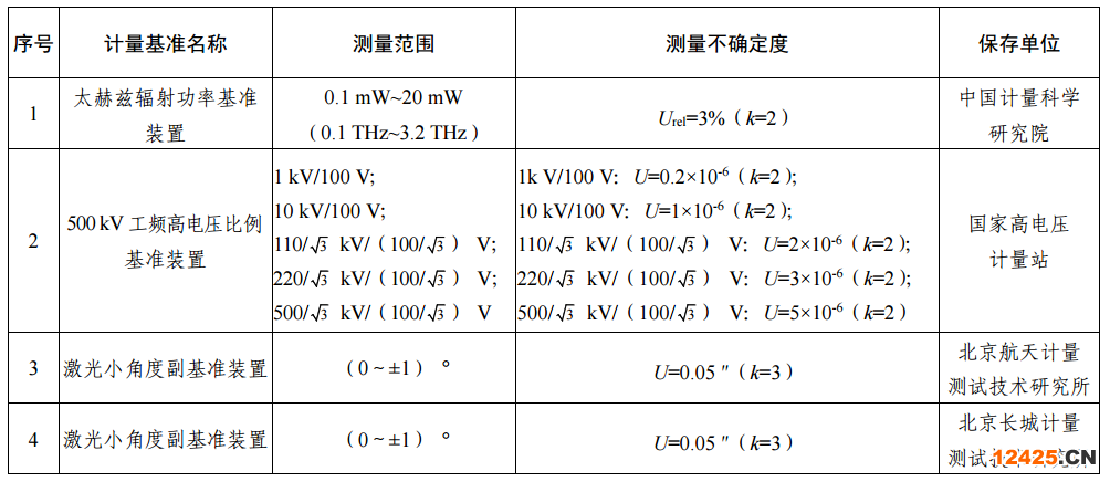 “太赫茲輻射功率基準(zhǔn)裝置”“500 kV工頻高電壓比例基準(zhǔn)裝置”“激光小角度副基準(zhǔn)裝置”等4項新建國家計量基準(zhǔn)予以公示