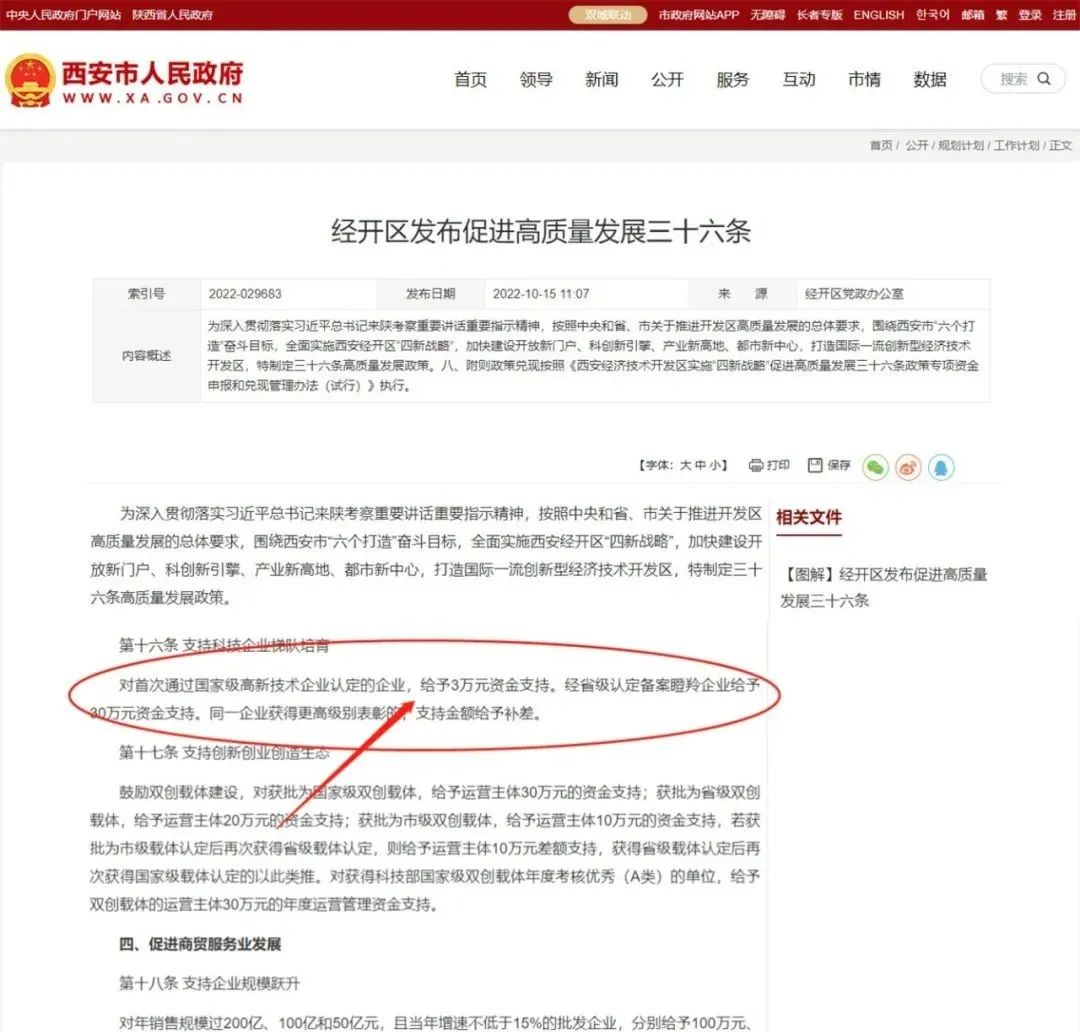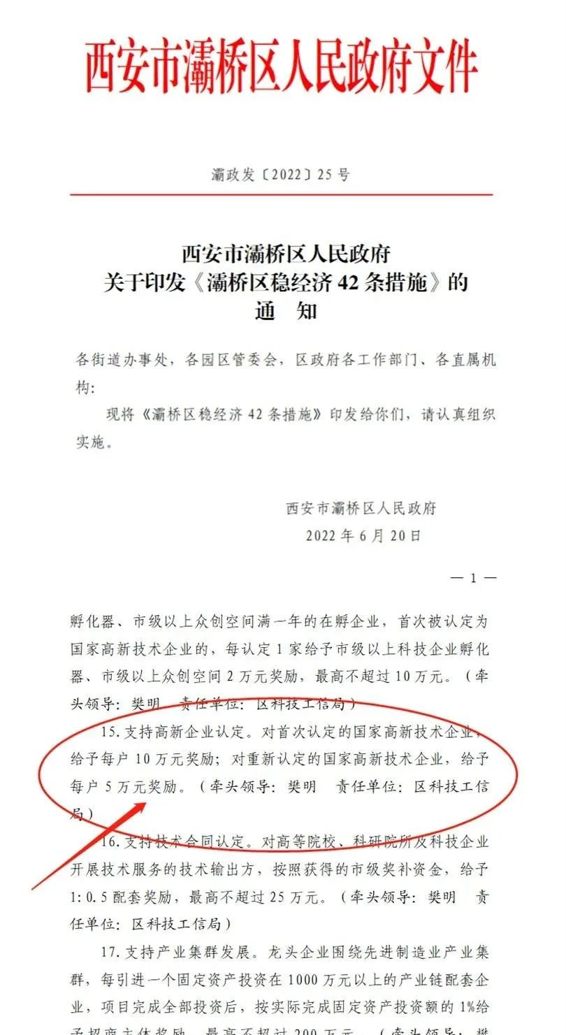 十八、高陵區(qū)對首次認(rèn)定為國家級高新技術(shù)企業(yè)的,依據(jù)《西安市高陵區(qū)穩(wěn)經(jīng)濟(jì)保增長若干措施申報指南》(高政辦發(fā)〔2022〕14號),給予10萬元一次性扶持。