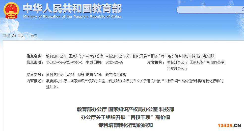 為深入貫徹黨的二十大精神,加快落實國家中長期科學(xué)和技術(shù)發(fā)展規(guī)劃、《知識產(chǎn)權(quán)強國建設(shè)綱要(2021—2035年)》的有關(guān)部署,深入實施《教育部關(guān)于加強高校有組織科研 推動高水平自立自強的若干意見》,推動《教育部 國家知識產(chǎn)權(quán)局 科技部關(guān)于提升高等學(xué)校專利質(zhì)量 促進轉(zhuǎn)化運用的若干意見》落實落地,切實提升高校專利創(chuàng)造質(zhì)量、加快轉(zhuǎn)化運用,教育部、國家知識產(chǎn)權(quán)局、科技部決定共同組織開展“百校千項”高價值專利培育轉(zhuǎn)化行動(簡稱“百校千項”行動),現(xiàn)將有關(guān)事項通知如下。
