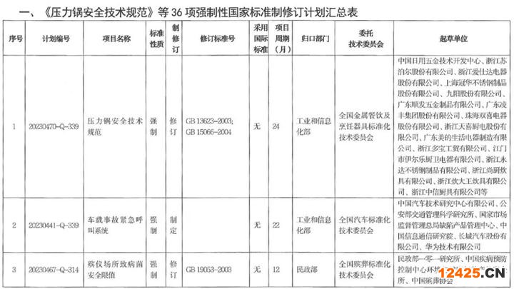 核心提示:近日,國家標準委發(fā)布通知,下達《壓力鍋安全技術規(guī)范》等36項強制性國家標準修訂計劃和9項強制性國家標準外文版計劃,詳情如下: