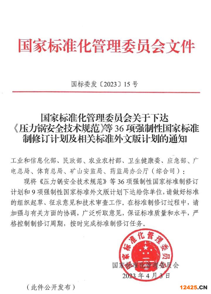 近日,國家標準委發(fā)布通知,下達《壓力鍋安全技術規(guī)范》等36項強制性國家標準修訂計劃和9項強制性國家標準外文版計劃,詳情如下:
