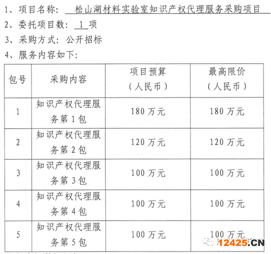 核心提示:近日,中國政府采購網(wǎng)發(fā)布《松山湖材料實(shí)驗(yàn)室知識產(chǎn)權(quán)代理服務(wù)采購項(xiàng)目招標(biāo)公告》。招標(biāo)文件中的采購需要章節(jié)中列出了《知識產(chǎn)權(quán)代理服務(wù)各