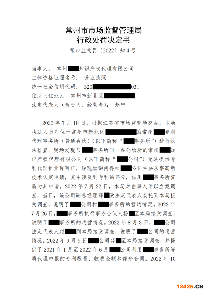 行政處罰相對(duì)人:常州XX知識(shí)產(chǎn)權(quán)代理有限公司
