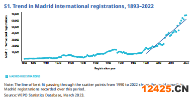 下圖為1893-2022年馬德里國(guó)際注冊(cè)的趨勢(shì):