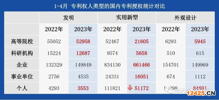 按照專利權(quán)人的類型進(jìn)行分類統(tǒng)計(jì)2023年4月國內(nèi)的專利授權(quán)量,5類專利權(quán)人的實(shí)用新型專利授權(quán)量全部下降。個(gè)人類型的實(shí)用新型授權(quán)量下降54.23%。