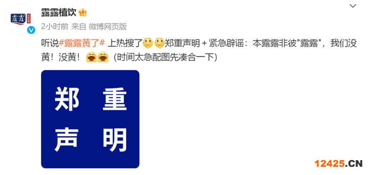 5月31日,“露露黃了”的話題登上微博熱搜,對此,承德露露通過其微博發(fā)布聲明:“聽說露露黃了上熱搜了。鄭重聲明+緊急辟謠:本露露非彼‘露露’,我們沒黃!沒黃!”