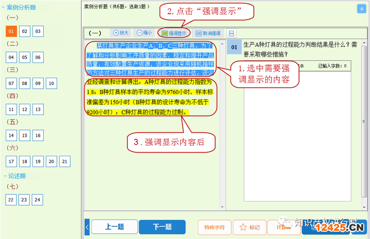 應(yīng)試人員可以根據(jù)需要對試題文字進行強調(diào)顯示或者取消強調(diào)顯示。選中對應(yīng)文字后點擊“強調(diào)顯示”按鈕,可將文字標(biāo)記為黃色。