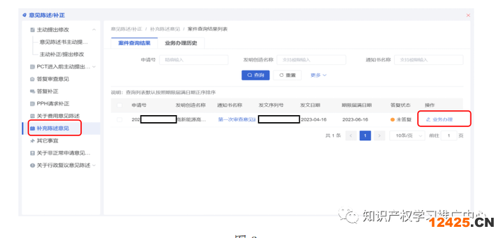 再次答復(fù)審查意見通知書,應(yīng)從“補(bǔ)充陳述意見”進(jìn)入,查詢到相應(yīng)通知書,再進(jìn)行辦理,如圖3紅色方框所示,以使系統(tǒng)能夠自動(dòng)生成勾選第二項(xiàng)的意見陳述書表格(如圖4.紅色方框中內(nèi)容即為生成后的勾選項(xiàng))。