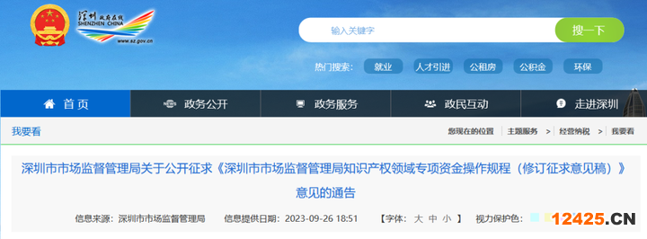 深圳市市場監(jiān)督管理局關(guān)于公開征求《深圳市市場監(jiān)督管理局知識產(chǎn)權(quán)領(lǐng)域?qū)m椯Y金操作規(guī)程(修訂征求意見稿)》意見的通告