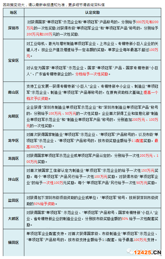 深圳市對國家制造業(yè)單項(xiàng)冠軍扶持獎(jiǎng)勵(lì)匯總